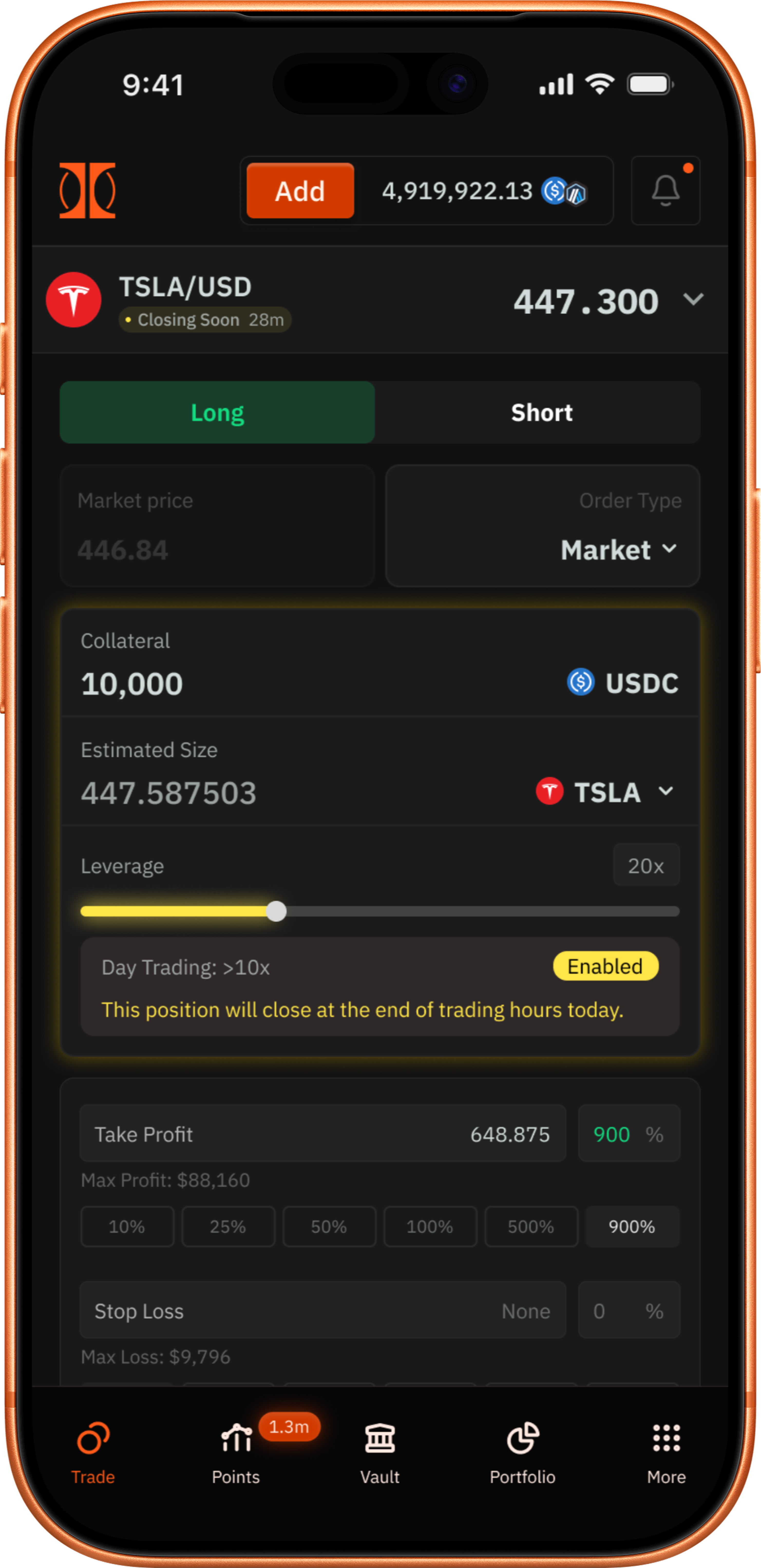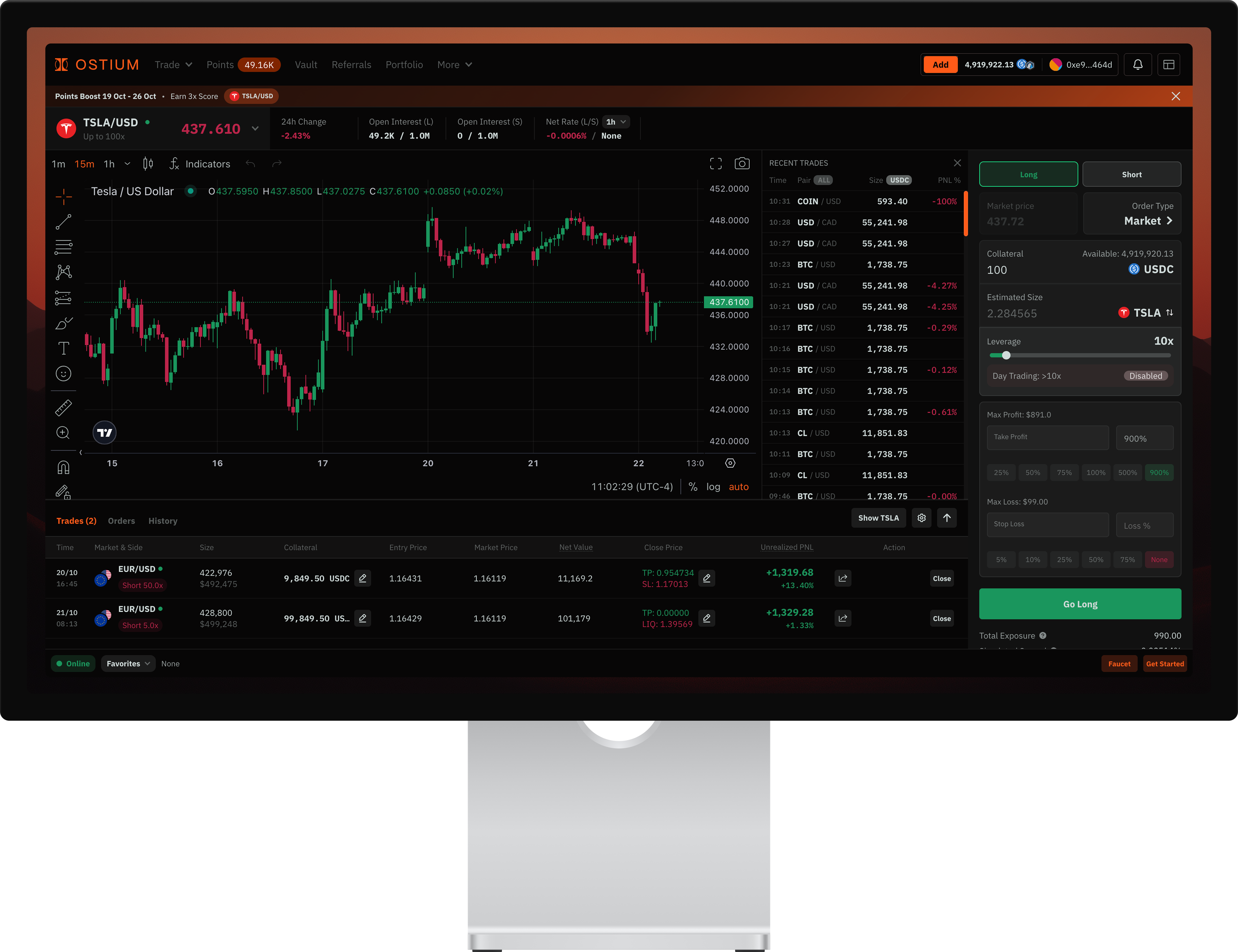 Ostium uses USDC (a stablecoin pegged to the U.S. dollar) on Arbitrum for trading and settlement.