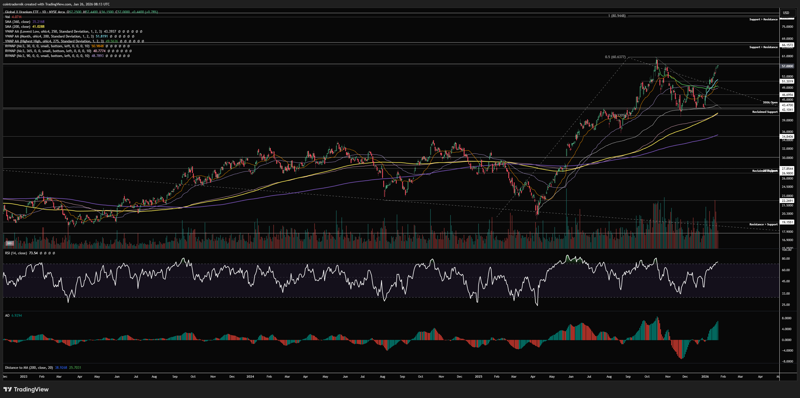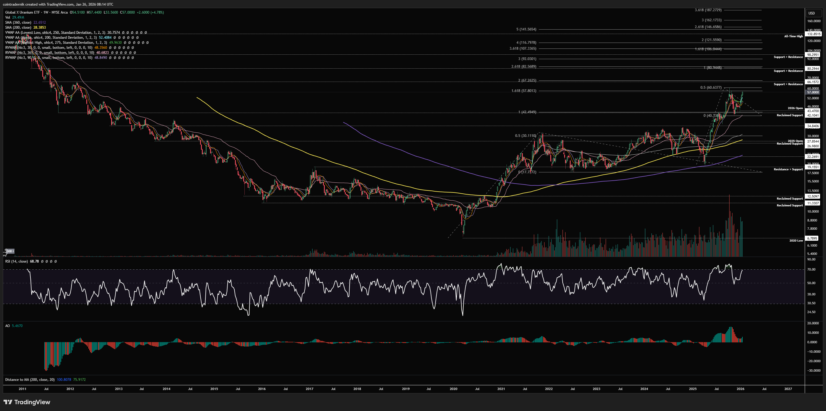 Beginning with the weekly for Uranium (with us specifically looking here at the Global X Uranium ETF - $URA), we can see that following a decade-long downtrend that culminated in a low at $6.79 during March 2020, the market bottomed out and began a new bull trend, with a multi-year top occurring at $30 in late 2021, followed by re-accumulation between range support at $19 and range resistance at $30. We then saw price break out above the range, reject at $35 and then correct back towards range support in early 2025, marking out a higher-low from which it v-reversed into fresh highs through $35. URA then continued higher into year-end, where it found resistance at $60.