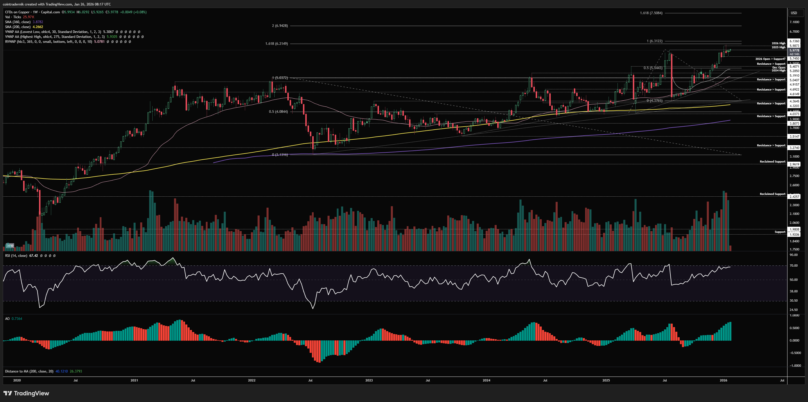 Beginning with the weekly for Copper, we can see that price is just consolidating right around all-time highs, with the 2026 open acting as support around $5.74 and price closing marginally below the 2025 high last week. This $6 level is what we want to see flipped into support for the next leg to begin, and I expect as Silver and Gold mark out local highs the rotation will favour Copper given the technical setup here right on the cusp of price discovery, with building momentum on the higher timeframes. If we can close the week above $6.14, I think we trade towards $6.95ish before we find any real resistance, with $7.50 and $8 the two key fib levels beyond that. If we fail to break out here, I would look for any higher timeframe retracement into $5.50ish as an opportunity to add at prior resistance turned support.