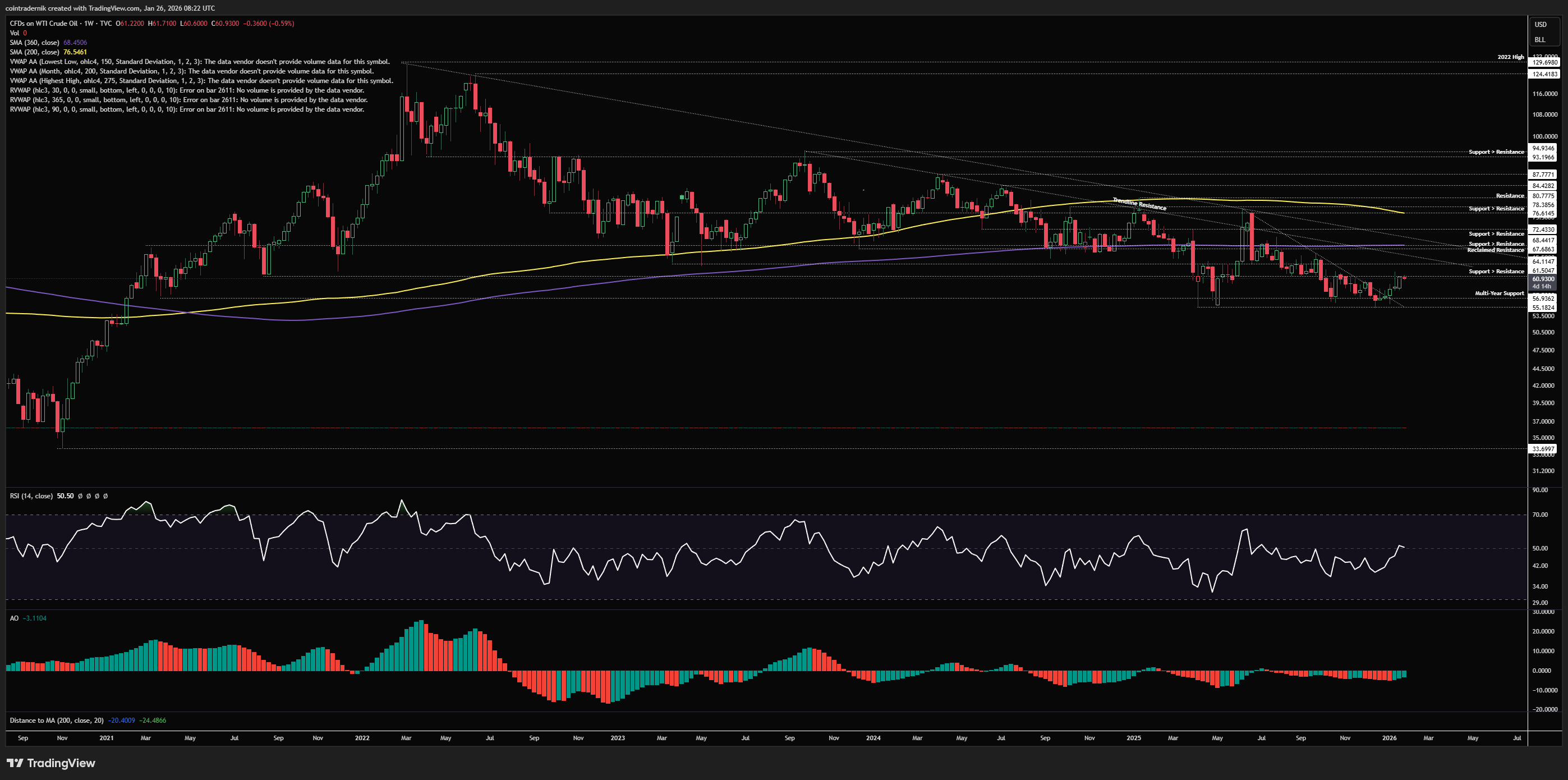 Beginning with the weekly for US Oil, we can see that price rejected at prior support turned resistance at $61.50 a couple of weeks ago after breaking out above multi-month trendline resistance off $55 support, but last week saw price push higher again off the open, closing right around that $61.50 level. Given the weekly trendline breakout and with RSI pushing back above 50 here, I expect $61.50 does not hold as resistance short-term, but rather price pushes through it and moves towards the next trendline, with $64-$65 likely to provide much more resistance. As mentioned a couple of weeks ago, whilst positioning is extreme in its expectation of further downside, this alone is not a catalyst for a major reversal, and I expect price-action to continue to be choppy and range-bound in early 2026. If, however, we can break and close above that trendline from the 2023 highs, flipping $64 into support, we can then entertain a move higher into $68.50, near the upper trendline. And above that, we have the 200wMA confluent with the 2025 highs around $77, which I expect will act as a ceiling throughout 2026 until the midterms have passed.