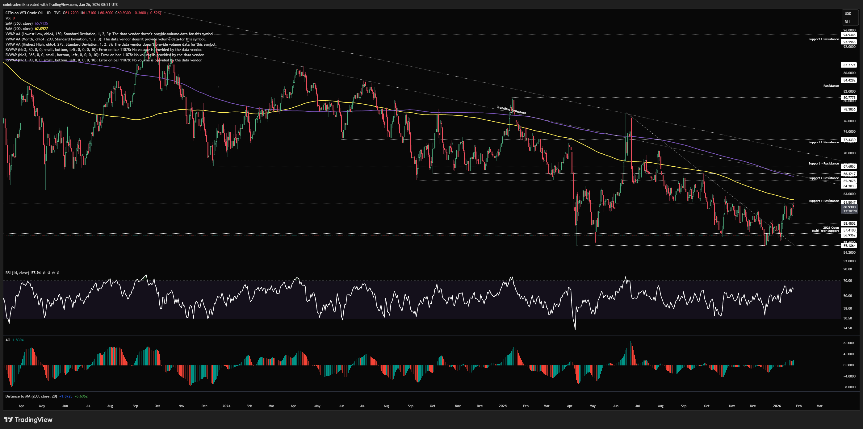 Turning to the daily, we can see that daily structure has turned bullish but momentum is struggling a little here at that prior support and 200dMA ~$61.50. Flip this area into support this week and I think we could bid a lower timeframe pullback into that level and target $65.20 into early Feb. This was obviously where I was expecting the relief rally to take price when I entered longs marginally above $57, but I cut most exposure at $61.50 and then got stopped in profit on the rest last week before price inevitably pushed back into weekly highs. As such, I am happy to look for longs again but not until we flip this resistance back into support. Alternatively, if we reject here again, I'd bid a sweep of last week's low into the yearly open, with invalidation on acceptance below $55.