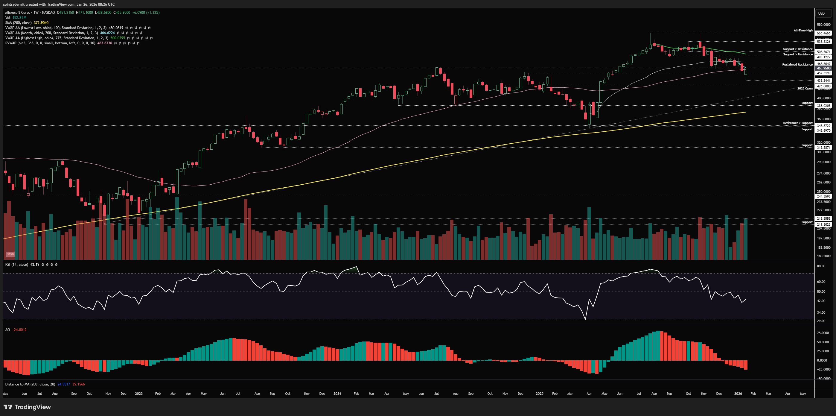 If we begin by looking at MSFT on the weekly timeframe, we can see that price has been trending down from the summer 2025 highs at $556, marking out a double top and then retracing into the 365d rolling VWAP in Q4, consolidating around there but with weak momentum, then breaking below prior resistance at $468 last week into $438, where price bounced and closed back near the weekly high. We are obviously still within a long-term bull trend on MSFT, with price still well above the April 2025 lows at $346 and firmly above trendline support from the 2022 lows, but we're kind of in no man's land here, having broken below prior resistance, with weak momentum and bearish weekly structure. There is some chance that the low of last week holds, of course, but if it doesn't then no doubt we retest the 2025 open around $425 (and I would bid that area as a gap hold). If last week's low does hold and we were simply deviating below 2024 highs only to reclaim them as support, then I would want to see price push higher this week above $480 (the anchored VWAP from the April 2025 lows), and then hold above $468, looking for lower timeframe pullbacks into that level to potentially bid for a move back towards $500 (the anchored VWAP from all-time highs). With regards to continuation to fresh highs, until we flip $500 into support again, the structure and momentum here is still weak and I wouldn't be so eager to hold levered exposure at major resistance. Above $500, we can look to re-assess and play dips into support back towards highs, but if we do get a nice little long from $470 being reclaimed as support into $500 then I'd absolutely bail at that level.