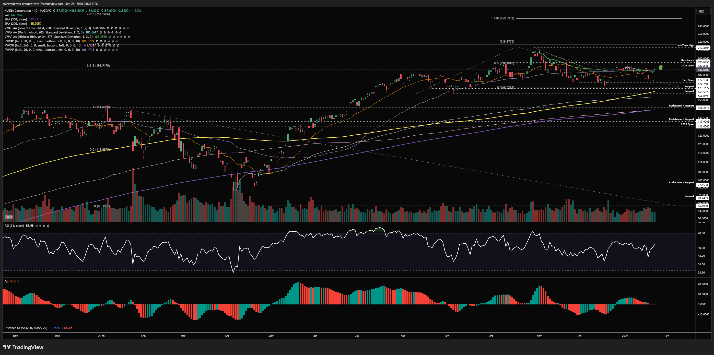 I have marked this out on the daily, but it's pretty clear to see just how much confluence we have in this $185-$195 range, with a break and close above $195 on this timeframe opening up that continuation leg higher into all-time highs. Daily structure and momentum are technically bullish and so we should expect $190-$195 to give way into February and price to trend higher from there. If we wick above $195 and reject and close back below the 2026 open at $189, we could look for tactical shorts back towards $177, but really I don't like shorting NVDA unless it validates a higher timeframe structural shift - and for me that only happens below the $160-$165 support zone. Not much else to add here for the time being...